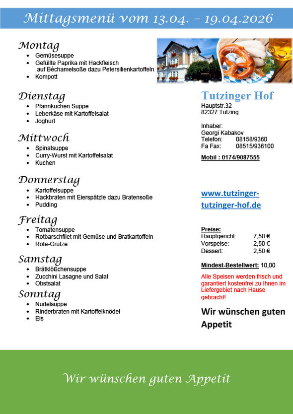 Bei dieser Gelegenheit möchte ich Sie auf unseren neuen Service hinweisen. Wir beliefern einige Firmen, Senioren und verschiedene Einrichtungen mit Mittagessen. Wenn Sie interessiert sind, nehme ich Sie gerne in den Verteiler auf (Kontakt / Anfragen).